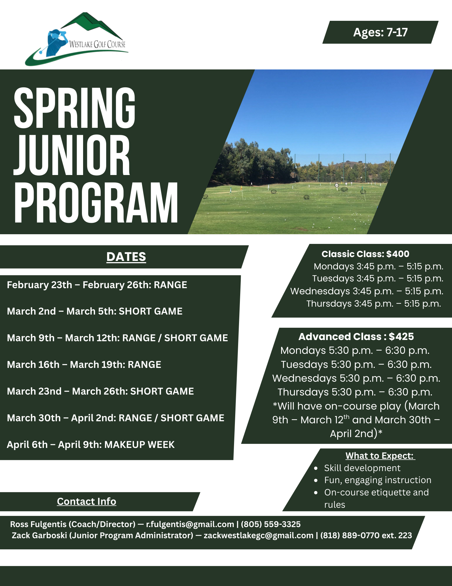 The 6-week, Spring 2026 program will kick off on February 23th with different class options Monday through Thursday. Please fill out the application below and check out our class options below, as well. We look forward to meeting you all, creating a fun-filled learning environment, and fostering your child’s passion for golf!