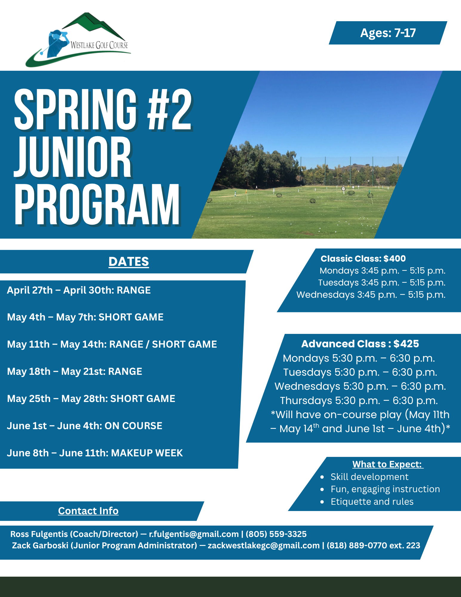 Our 2nd 6-week Spring program will kick off on April 27th with different class options available Monday through Thursday. Please fill out the application below and review our class options as well. We look forward to meeting you all, creating a fun-filled learning environment, and fostering your child’s passion for golf!